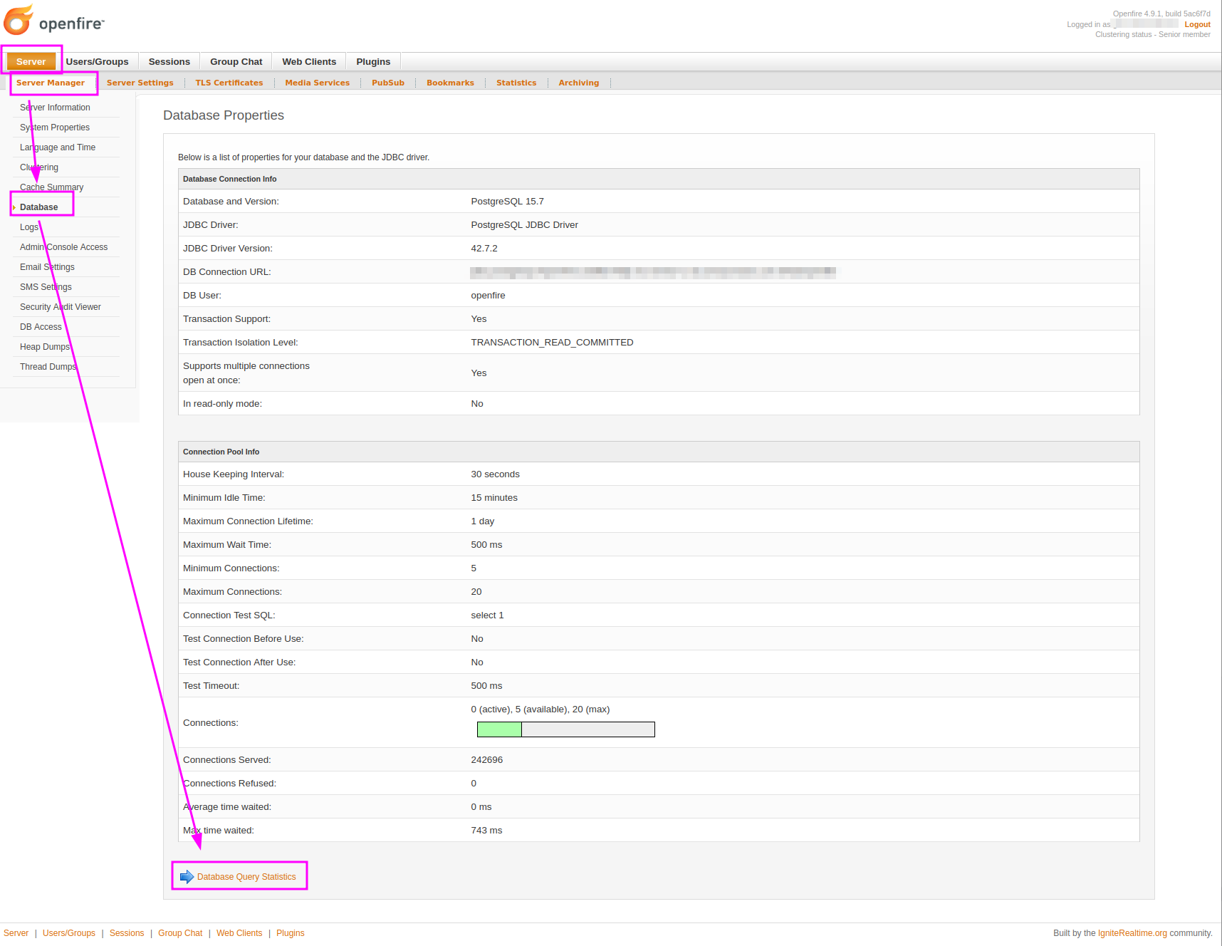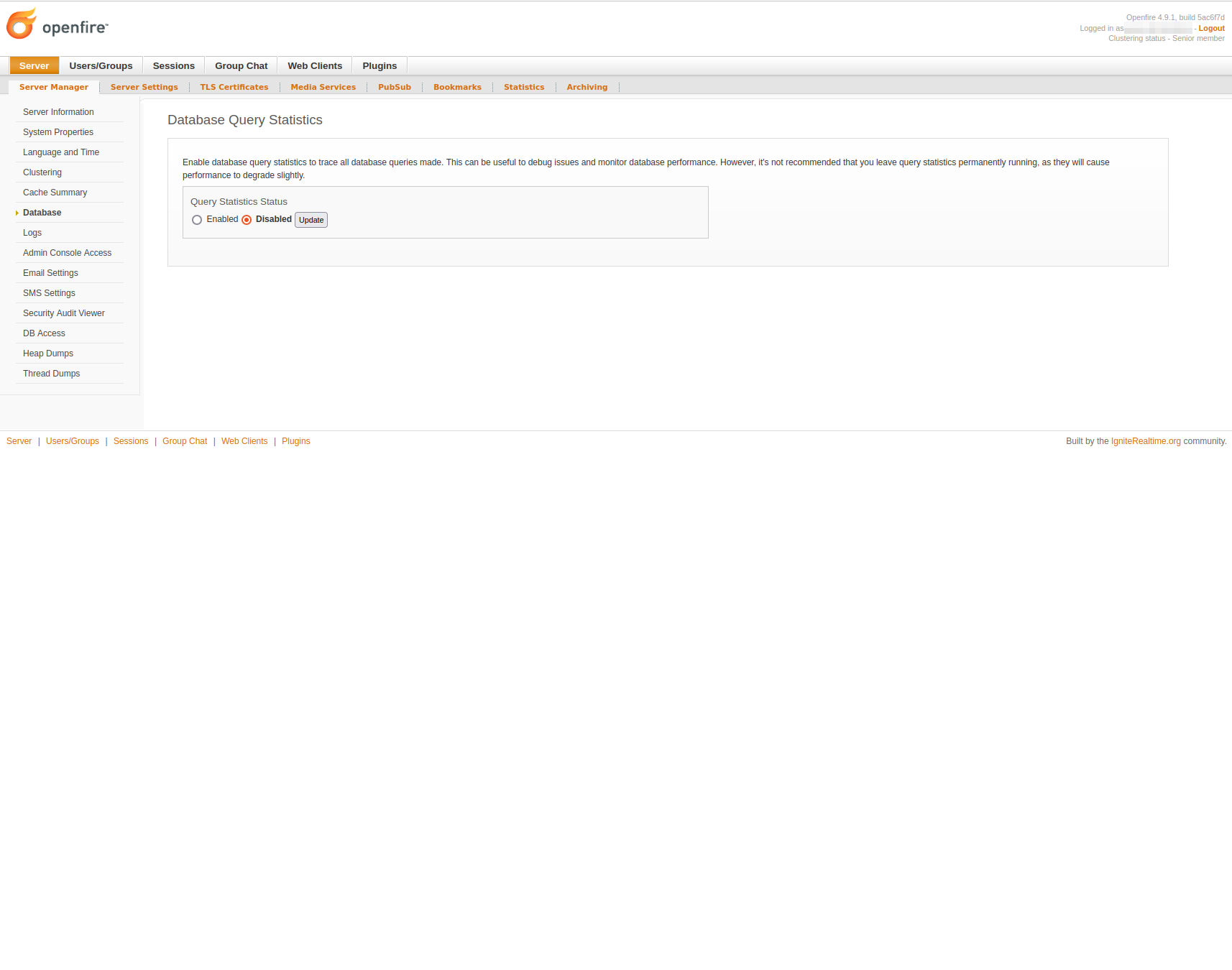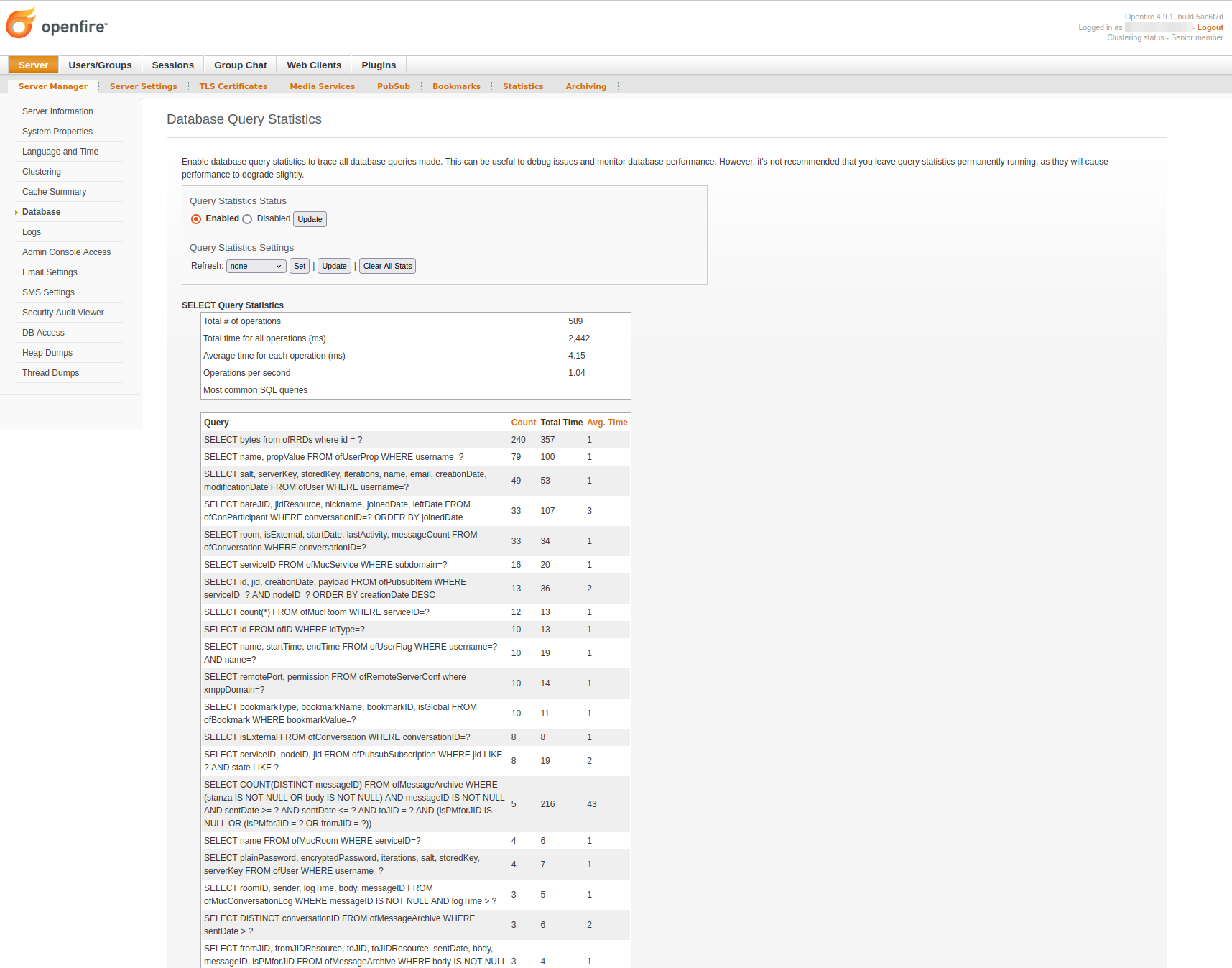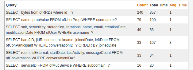 Once enabled, the Database Query Statistics will group the database queries that are executed by Openfire. For each query, the following data is collected: