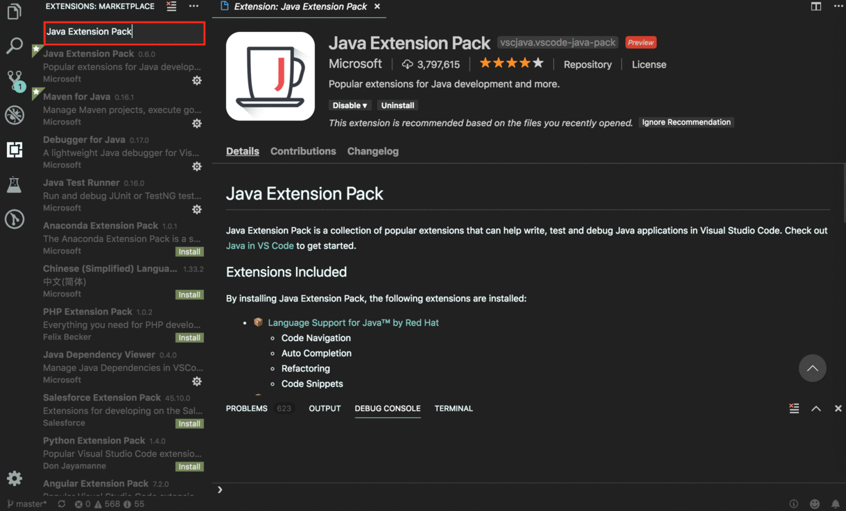 Launch your VS Code and bring up extensions view by clicking on the Extensions icon in the Activity Bar on the left side of VS Code or View > Extensions then write the name of extension Java Extension Pack and then click on install link to install all extensions for Pack.