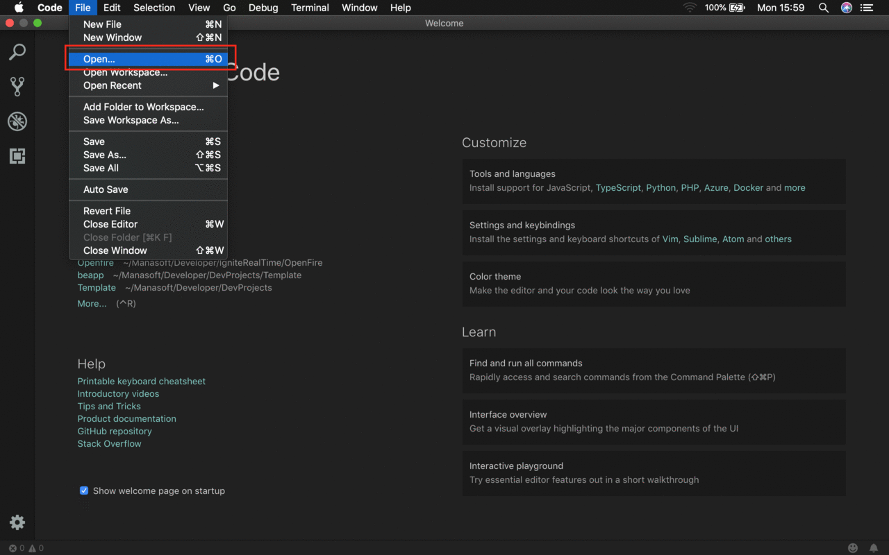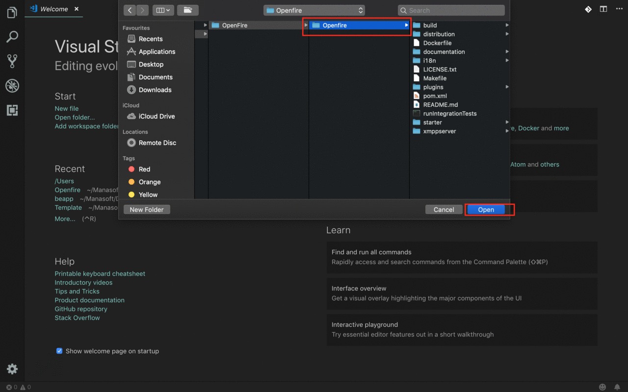 Select the 'Open' option -- File > Open and choose your Openfire source code folder then click on the open button. This will quickly import the Openfire source code into VS Code .
