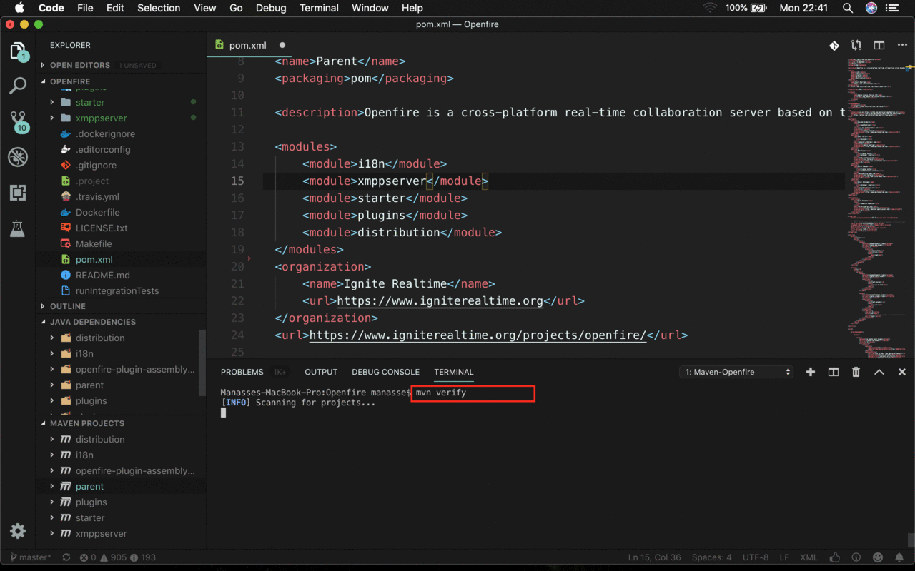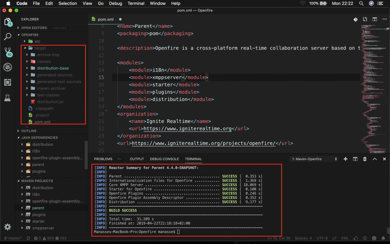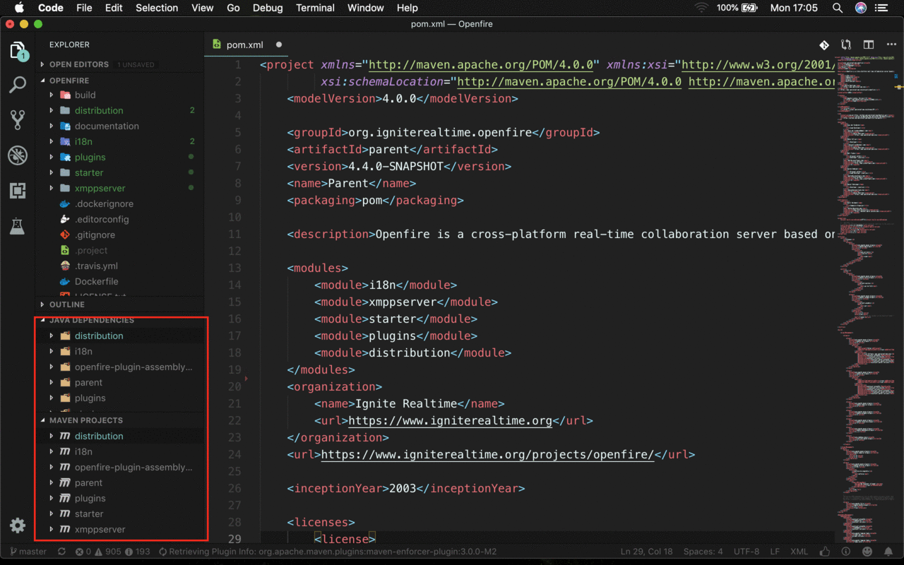 The Openfire source code is using an Apache Maven project structure. As VS Code (with Maven Extension) recognizes this structure, opening the source code into an VS Code project is very easy.