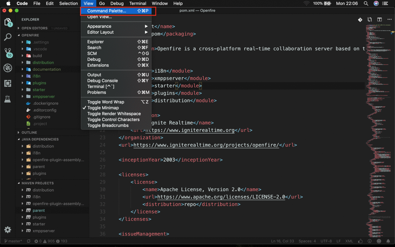 Visual Studio Code or VS Code is a fast editor and ships with great editing features. It includes support for debugging, embedded Git control, syntax highlighting, intelligent code completion, snippets and code refactoring. In part thanks to the huge ecosystem of extensions that enhance and enrich the experience in VS Code, turning it into a super smart text editor, fast and lightweight. This guide focuses on the bare minimum that is needed to get started Openfire source code with VS Code.